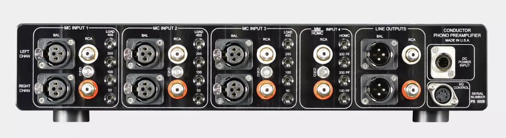 • Flexible Configuration: The CONDUCTOR can be ordered with one to four active cartridge inputs. Inputs 1,2, and 3 are dedicated for Moving Coil (MC) cartridges and Input 4 is dedicated only for Moving Magnet (MM) or High Output Moving Coil (HOMC) cartridge types.